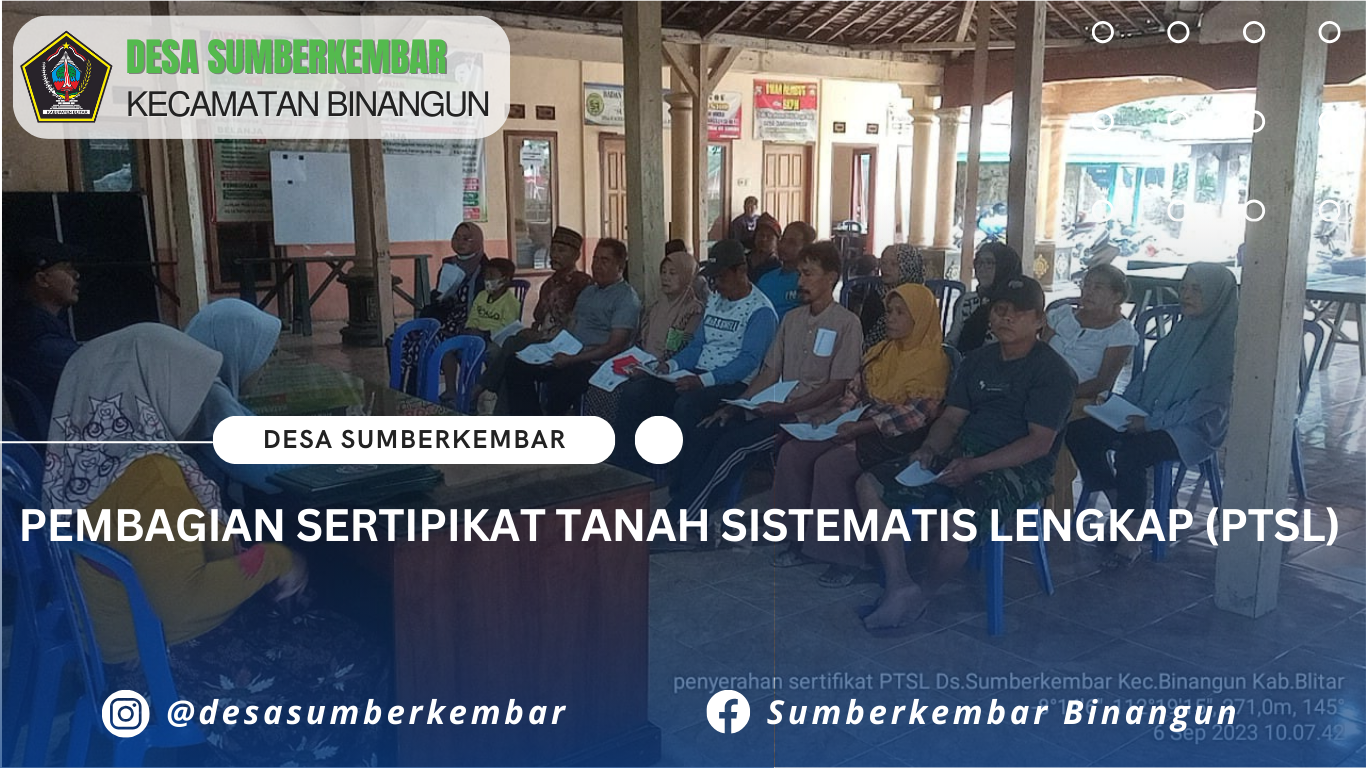 Pada hari Rabu (6/9/2023) telah dilaksanakan penyerahan  Sertipikat Tanah Sistematis Lengkap (PTSL). Penyerahan Sertipikat Hak Milik ini adalah program lanjutan dari PTSL tahun 2021. Sebanyak 31 sertipikat hak milik di serahkan kepada masyarakat yang sudah mendaftarakan tanahnya yang terletak di desa Sumberkembar, sertipikat diserahkan langsung oleh bapak ketua POKMAS desa Sumberkembar.
